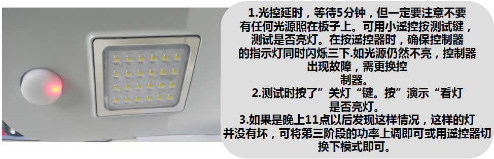(2)待趕到現(xiàn)場后,先用小遙控按測試鍵是否亮燈?(請確保小遙控在有效距離三米內(nèi),并且指示燈同時閃爍三下)若果燈不亮,可判定燈工作出現(xiàn)異常。需要進(jìn)一步進(jìn)行排查。如果燈是亮的,并且指示燈正常閃爍在充電,外界的因素比較大,比如陰雨天遮擋等。