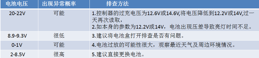 (1)通過前七天的電池HV和LV判斷,其中有一天電池電壓低于9.3V,或HV為20多伏幾乎接近太陽能板空載電壓,通常可判定燈可能出現(xiàn)異常,分以下情況: